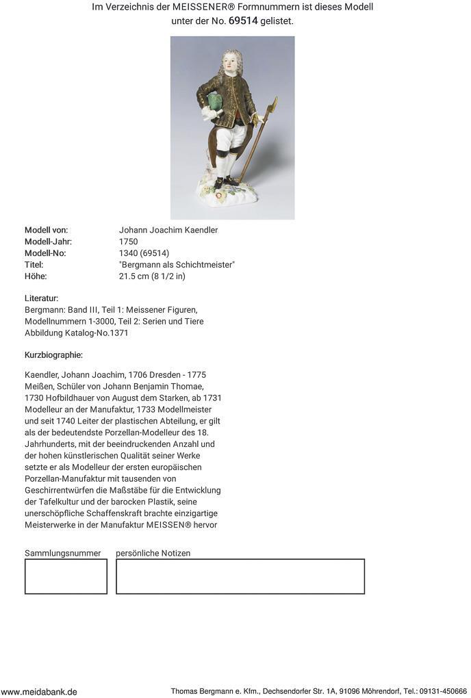 Kaendler, Hofbildhauer und Modelleur, seit 1731 an der Manufaktur, ab 1749 Leiter der plastischen Abteilung * Partnerauktion Bergmann.