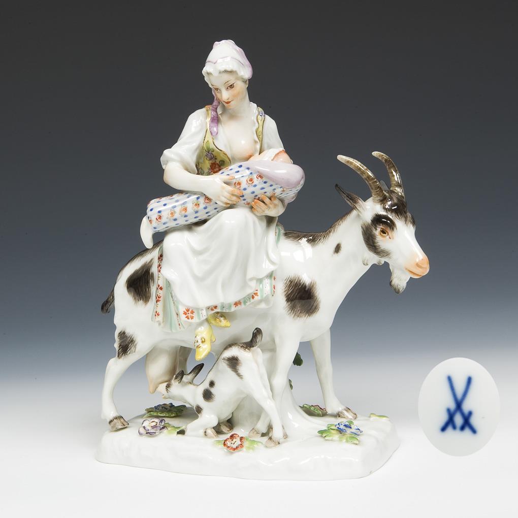 Modell von Johann Friedrich Eberlein 1740. Farbig bemalt, gold staffiert. Pendant zu Modell-Nr. 171 "Schneider auf Ziegenbock". Ritzmarke, Pressmarke, Schwertermarke. Bock-Ohren, rückseitig Blätter restauriert.