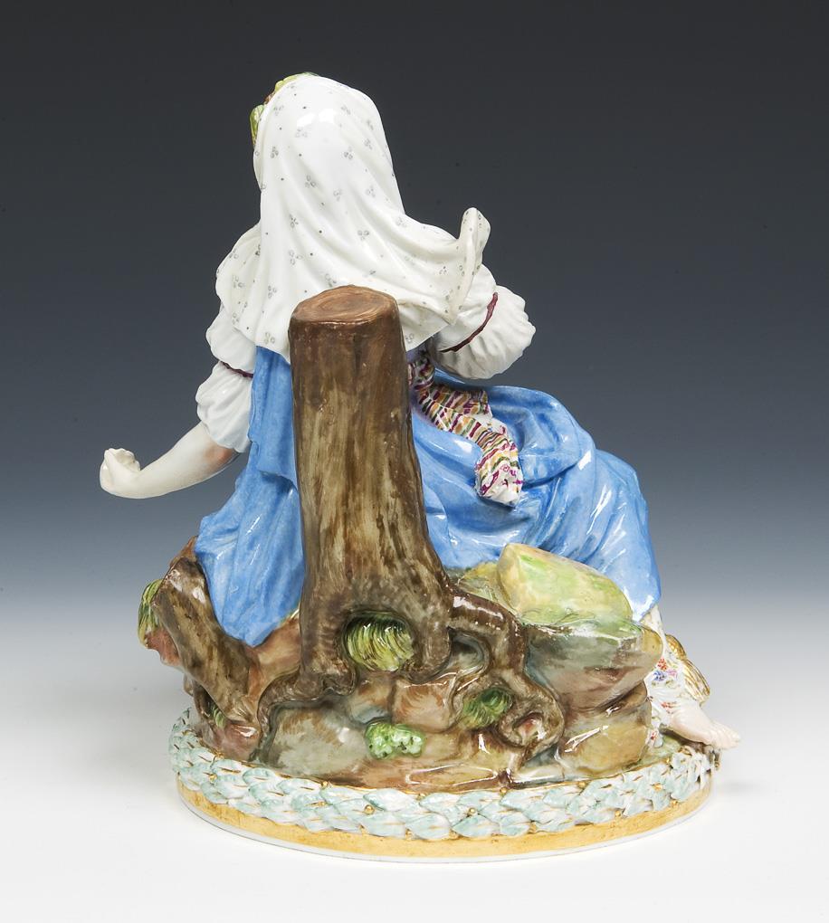Modell von Johann Joachim Kaendler 1772-1775. Aus einer Serie von zehn Figuren. Farbig bemalt, gold staffiert. Ritzmarke, Pressmarke, Schwertermarke. Ein Arm, ein Unterarm, Kopftuchzipfel, Füße, rückseitig Fels- und Baumoberflächen restauriert, Baum und Amorette fehlen, eine Zehe bestoßen.