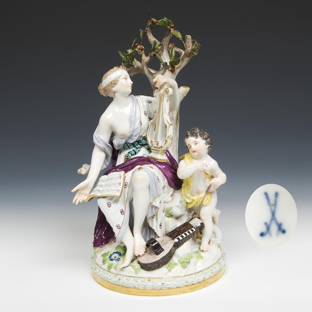 Modell von Johann Joachim Kaendler 1772-1775. Aus einer Serie von zehn Figuren. Farbig bemalt, gold staffiert. Pressmarken, Malermarke, Schwertermarke. Eine Hand, Blätter, Äste restauriert, Pfeil bestoßen, einige Blätter fehlen.
