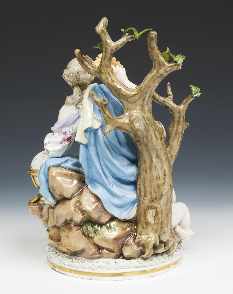 Modell von Johann Joachim Kaendler 1772-1775. Aus einer Serie von zehn Figuren. Farbig bemalt, gold staffiert. Ritzmarke, Pressmarke, Malermarke, Schwertermarke. Feder, eine Schriftbogenecke, eine Hand, Blätter, Astspitzen, Winkelmesser restauriert, Blätter fehlen.