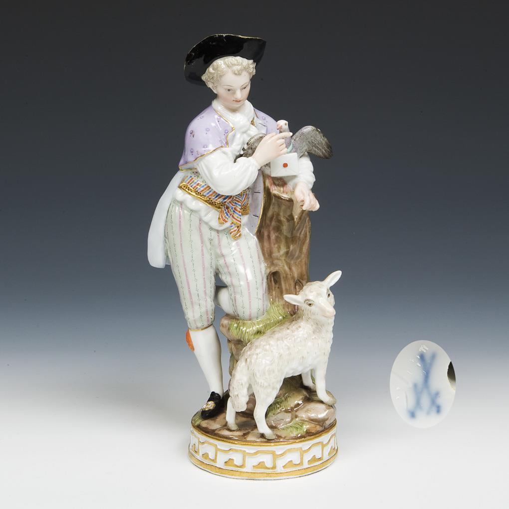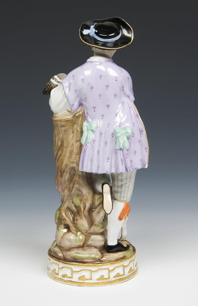 Modell von Michel Victor Acier 1777. Pendant zu Modell-Nr. F 73 x "Schäferin mit Vogelbauer". Farbig bemalt, gold staffiert. Ritzmarke, Pressmarke, Malermarke, Schwertermarke. Hutkrempe, drei Finger restauriert, eine kleine Rockecke bestoßen.