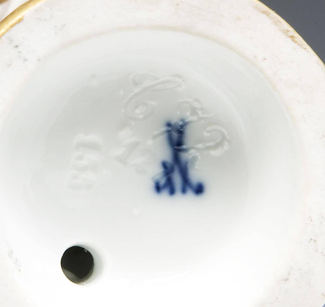 Modell von Michel Victor Acier 1768-1770. Pendant zu Modell-Nr. C 73. Farbig bemalt, gold staffiert. Ritzmarke, Pressmarke, Malermarke, Schwertermarke. Wenige Blättchen restauriert, rückseitig ein Stoffzipfel bestoßen.