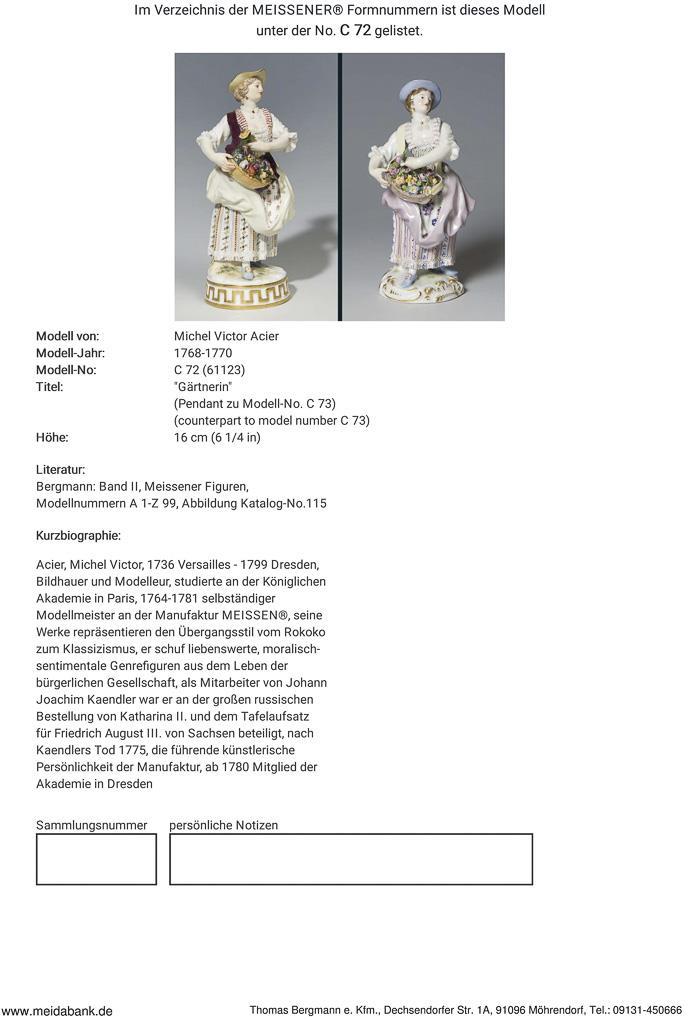 Acier, Bildhauer und Modelleur, studierte an der Akademie in Paris. 1764-1781 selbständiger Modellmeister in Meissen. Meissen-Manufaktur-Preis: 3790,- Euro * Partnerauktion Bergmann.