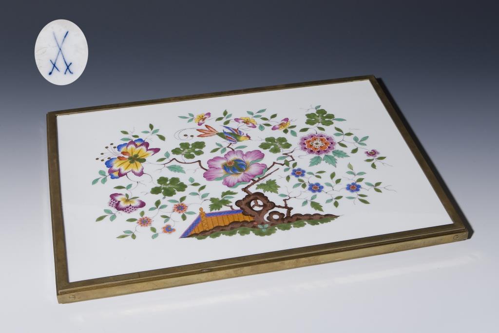 Großflächige Indischmalerei mit Felsen, Blumen mit Goldpunkten und Paradiesvogel.46 x 34 cm.