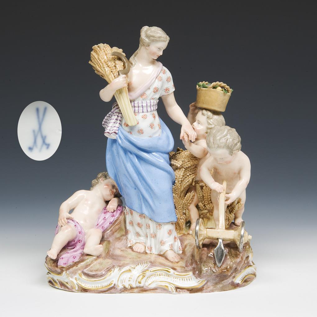 Modell von Michel Victor Acier 1770. Aus einer Serie von vier Figuren. Farbig bemalt, gold staffiert. Ritzmarke, Pressmarke, Malermarke, Schwertermarke. Zwei Hände, ein Bein, Sichel, einige Ährenspitzen, Korb restauriert.