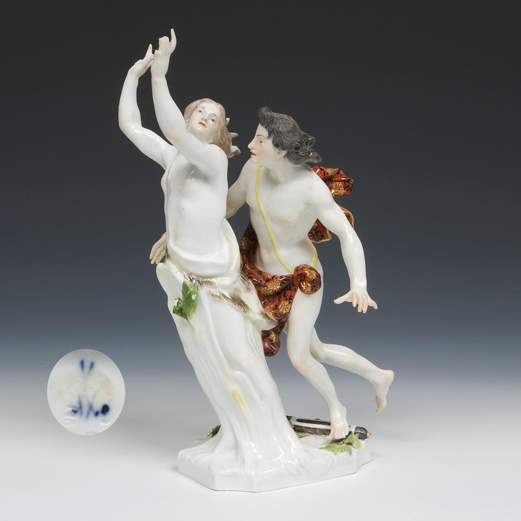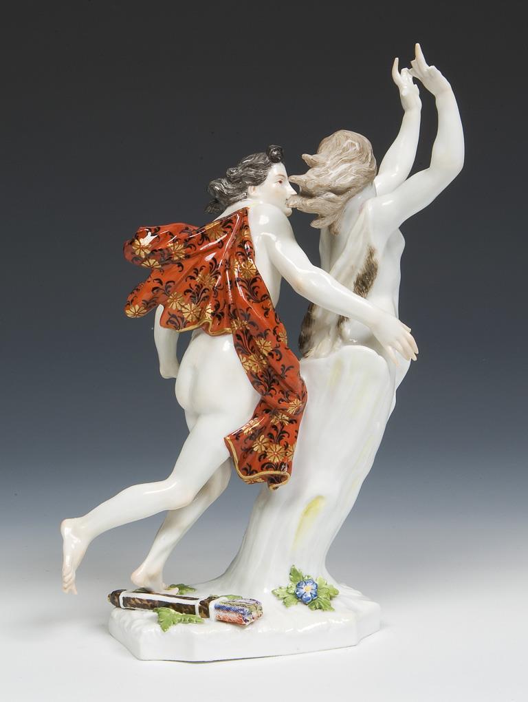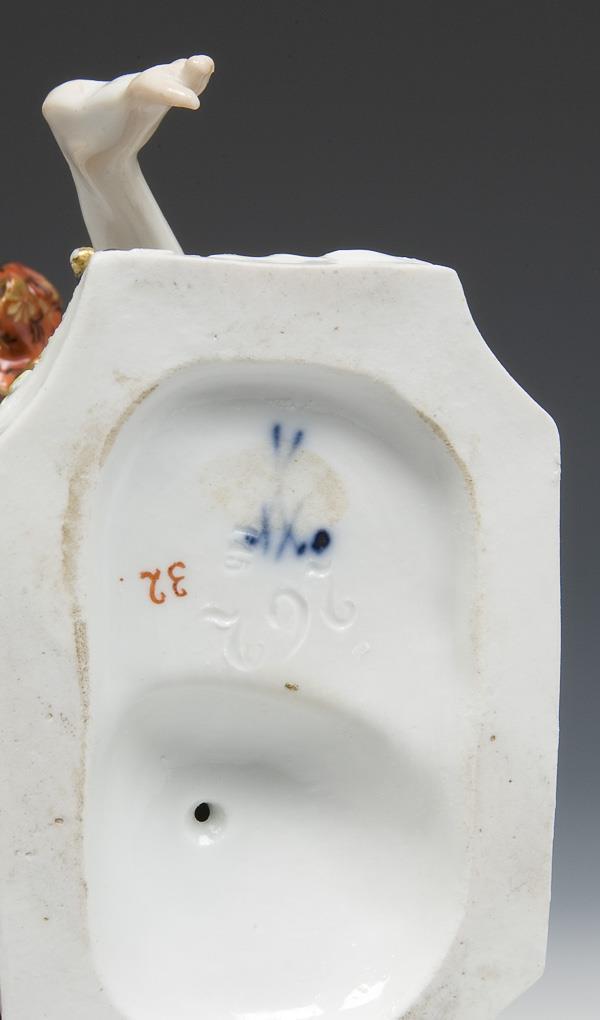 Modell von Johann Friedrich Eberlein 1741. Farbig bemalt, gold staffiert. Ritzmarke, Pressmarke, Malermarke, Schwertermarke. Ein Blatt, sieben Finger bestoßen, ein Arm geklebt, eine Hand restauriert, sechs Finger lose vorhanden.