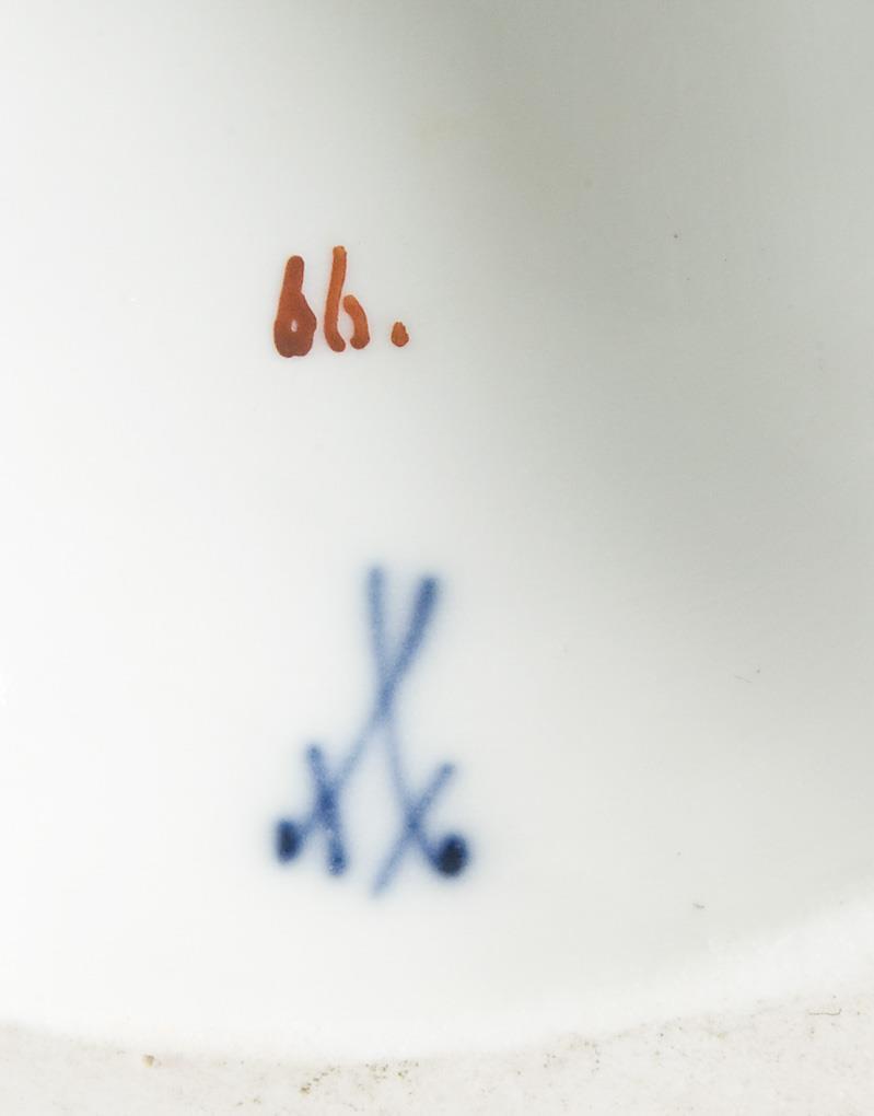 Modell von Peter Reinicke 1747. Farbig bemalt, gold staffiert. Pendant zu Modell-Nr. 346. Ritzmarken, Malermarke, Schwertermarke. Eine Hand, Blätter am Rosenstrauch restauriert, ein Blatt bestoßen.