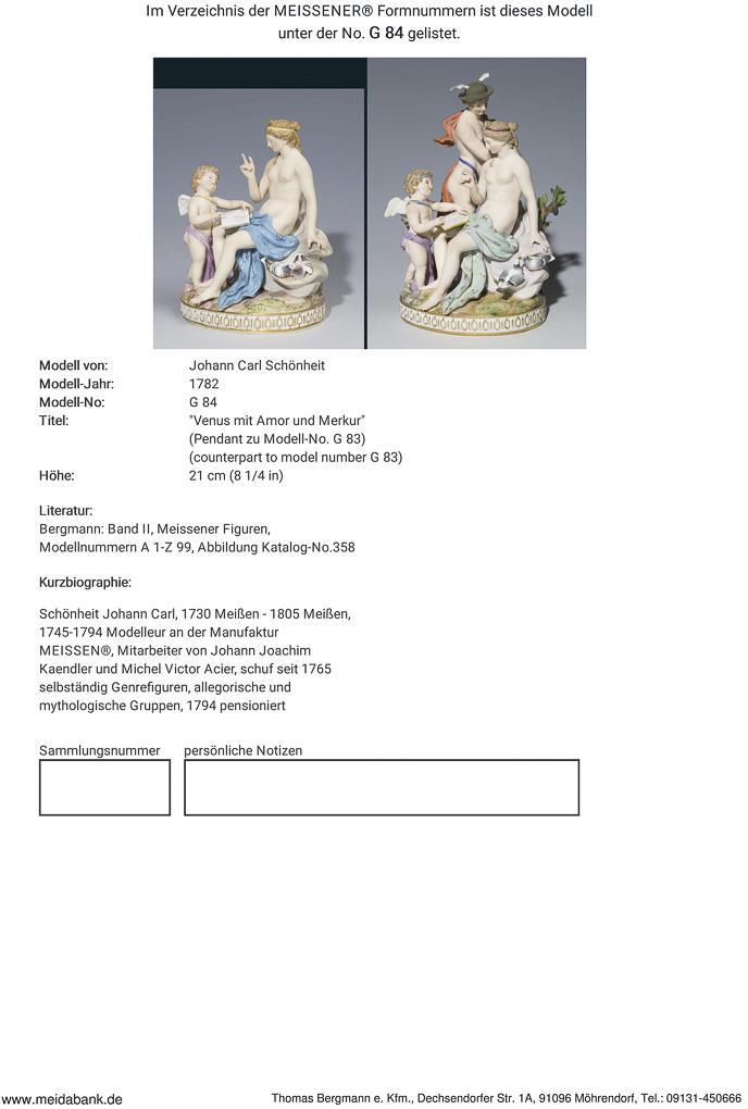 Modell von Johann Carl Schönheit 1782. Pendant zu Modell-Nr. G 83. Farbig bemalt, gold staffiert. Ritzmarke, Pressmarke, Malermarke, Schwertermarke. Flügel, Köcher, eine Hand, ein Arm, ein Unterarm, ein Bein, eine Taube, Ast, Blätter, Merkurstab restauriert.