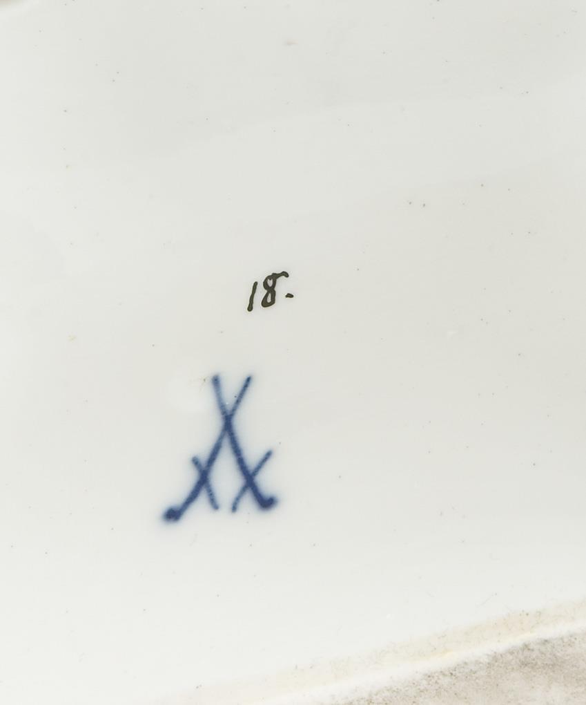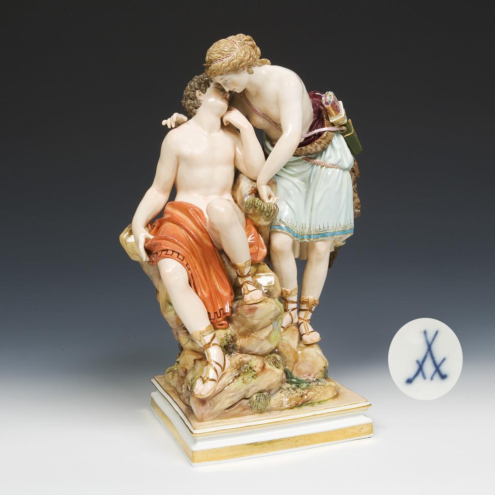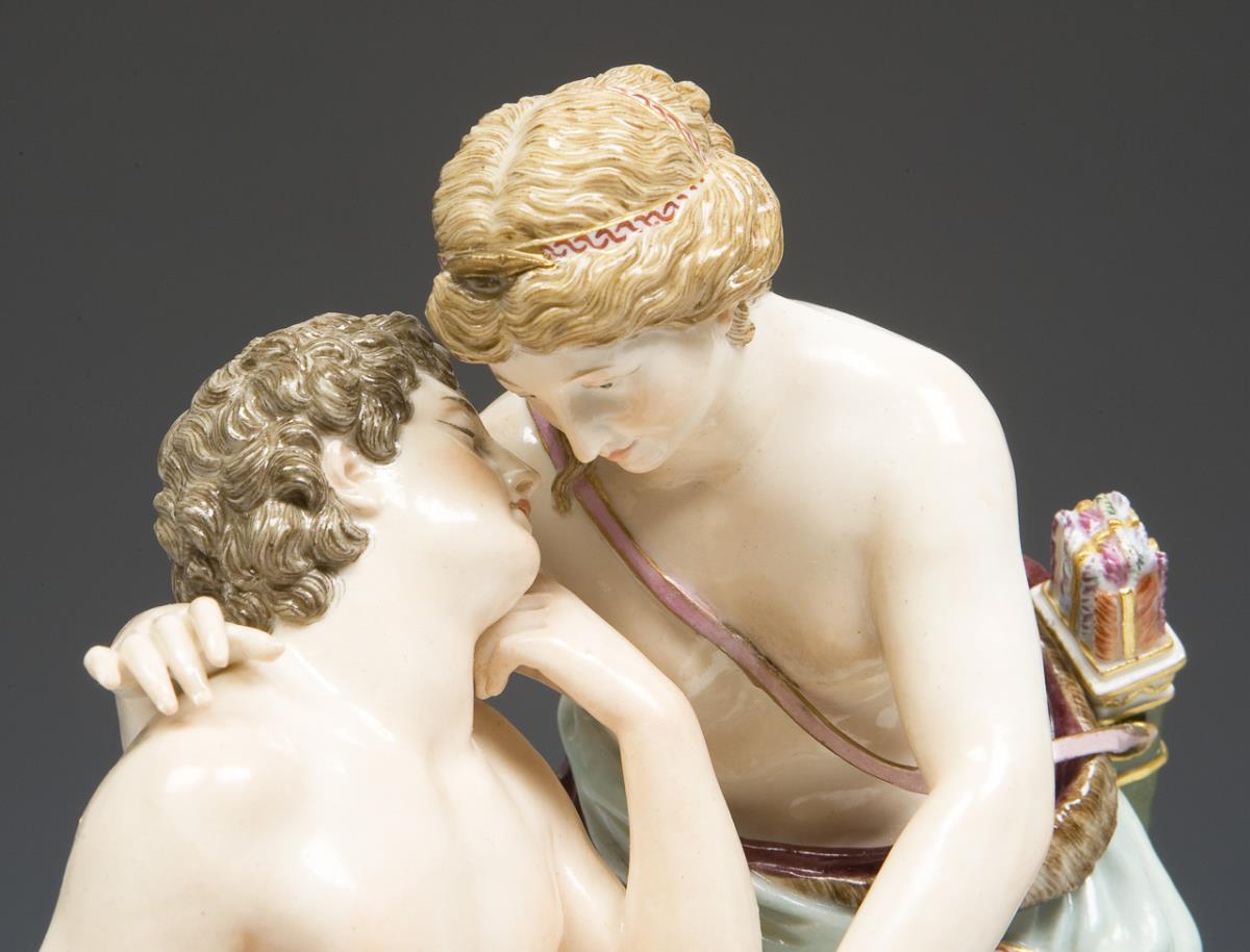 Modell von Christian Gottfried Jüchtzer 1786. Farbig bemalt, gold staffiert. Ritzmarke, Pressmarke, Malermarke, Schwertermarke. Köcher, Fellumhang, Blätter, ein Arm, Köcherband restauriert, einige Blätter bestoßen.
