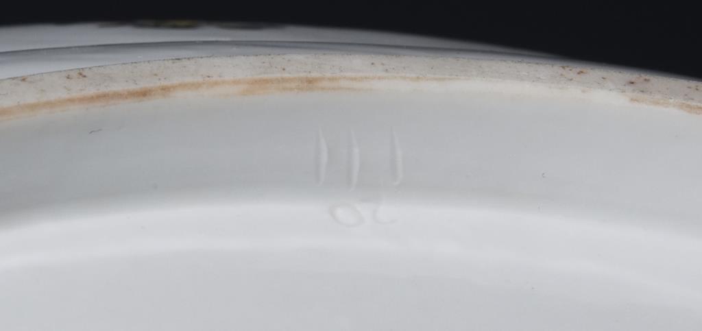 Reliefdekor "Sulkowsky". Im Spiegel großflächige Goldkartusche mit Gitterwerk und Ornamentrahmen in Korallenrot und Purpur, darin Feldlagerszene. Am Spiegelrand indianische Blumen in vierfachem Rapport. Rückseitig indianische Blumen. Goldstaffage wohl später. Eine Randecke restauriert.