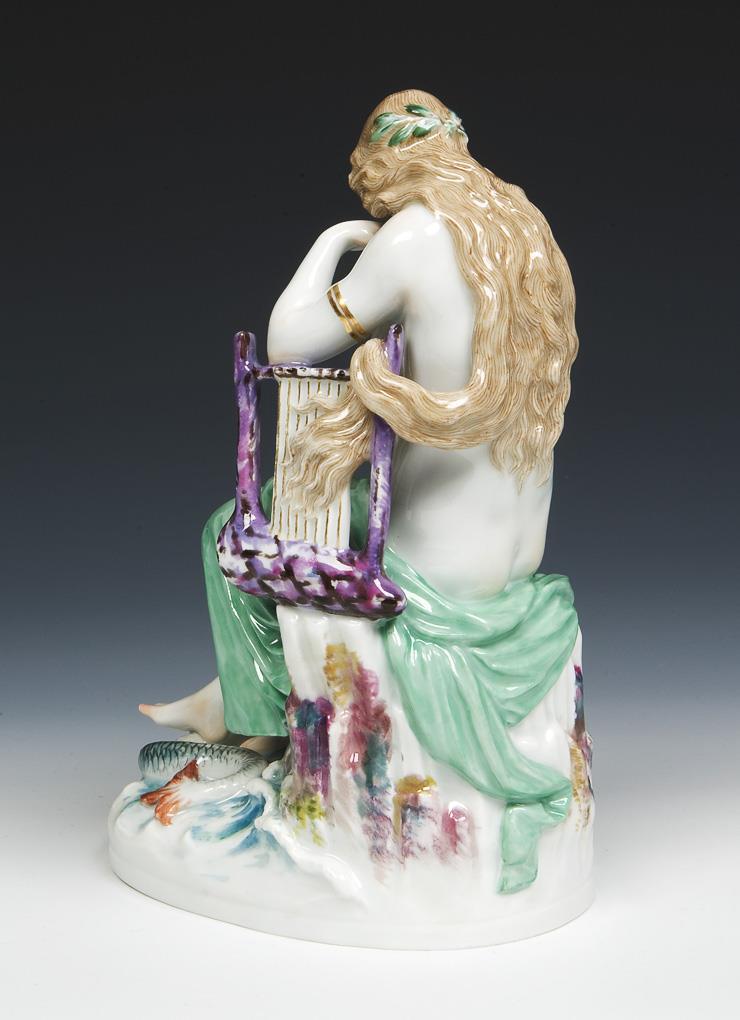 Modell von Ludwig Schwanthaler 1882-1885. Pendant zu Modell-Nr. N 108 "Omphale". Farbig bemalt, gold staffiert. Ritzmarke, Pressmarke, Malermarke, Schwertermarke. Ein Fuß, ein Fisch partiell, ein Lyrasteg restauriert.