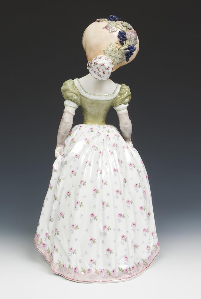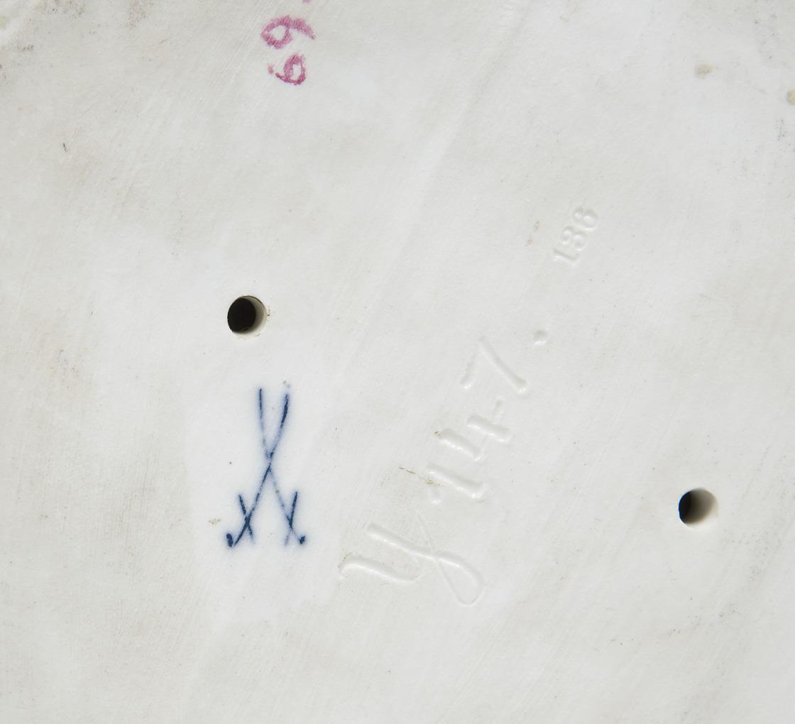 Modell von Martin Wiegand 1906-1909. Farbig bemalt. Unglasierter Boden, Ritzmarke, Pressmarke, Malermarke, Schwertermarke. Hut, Blätter, Trauben partiell restauriert.