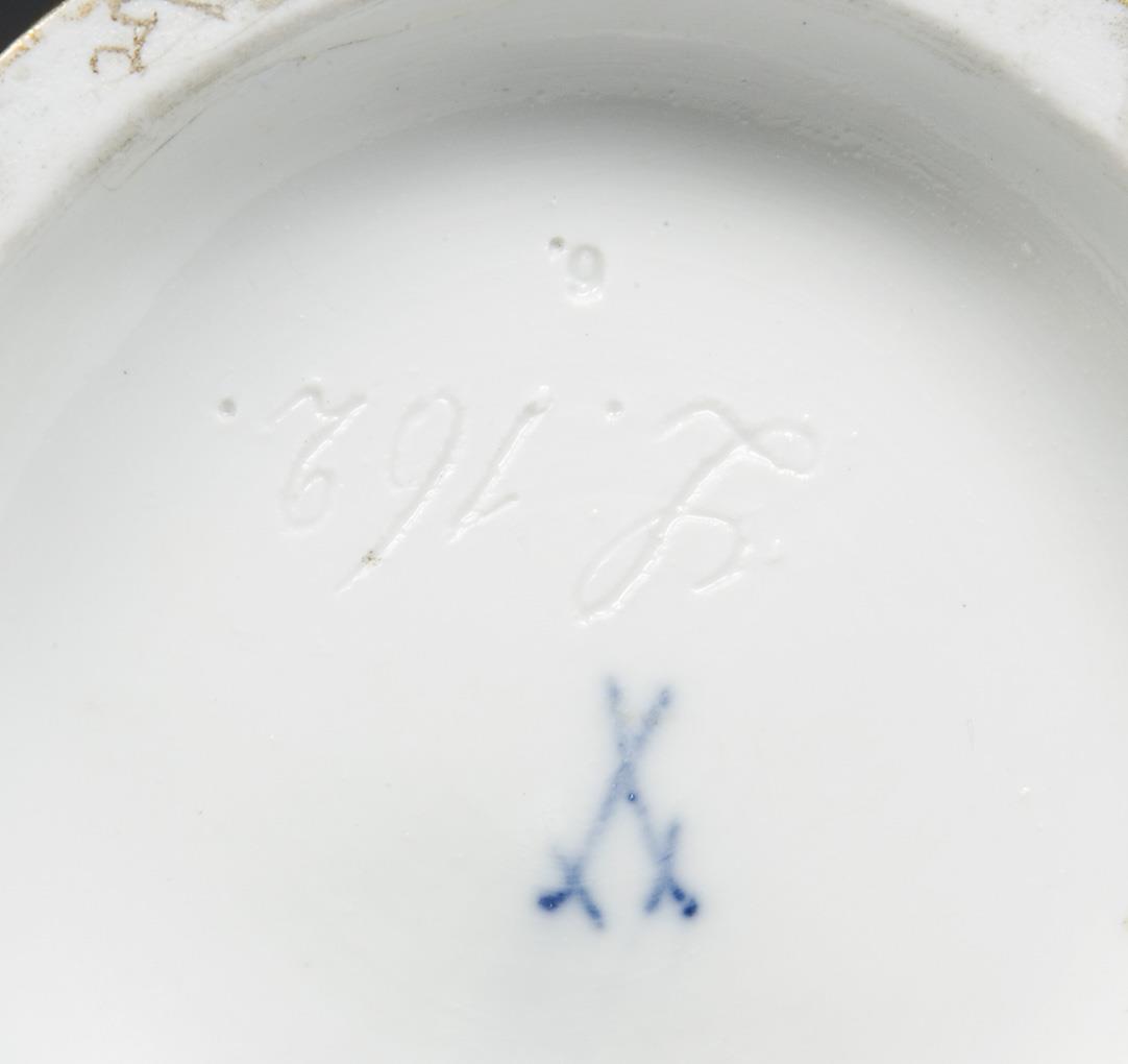 Modell von Jakob Ungerer 1881. (Pendant zu Modell-Nr. L 163 "Dame mit Katze", Kat. Nr. 3218). Farbig bemalt, gold staffiert. Ritzmarke, Pressmarke, Schwertermarke. Teilweise sichtbar alt drei Viertel der Figur restauriert.