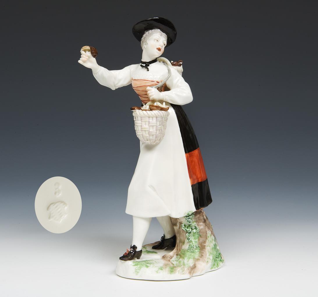 Modell von Franz Anton Bustelli um 1755. Farbig bemalt. Ritzmarken, Pressmarke. Hut, ein Henkel restauriert, Schleifen bestoßen.