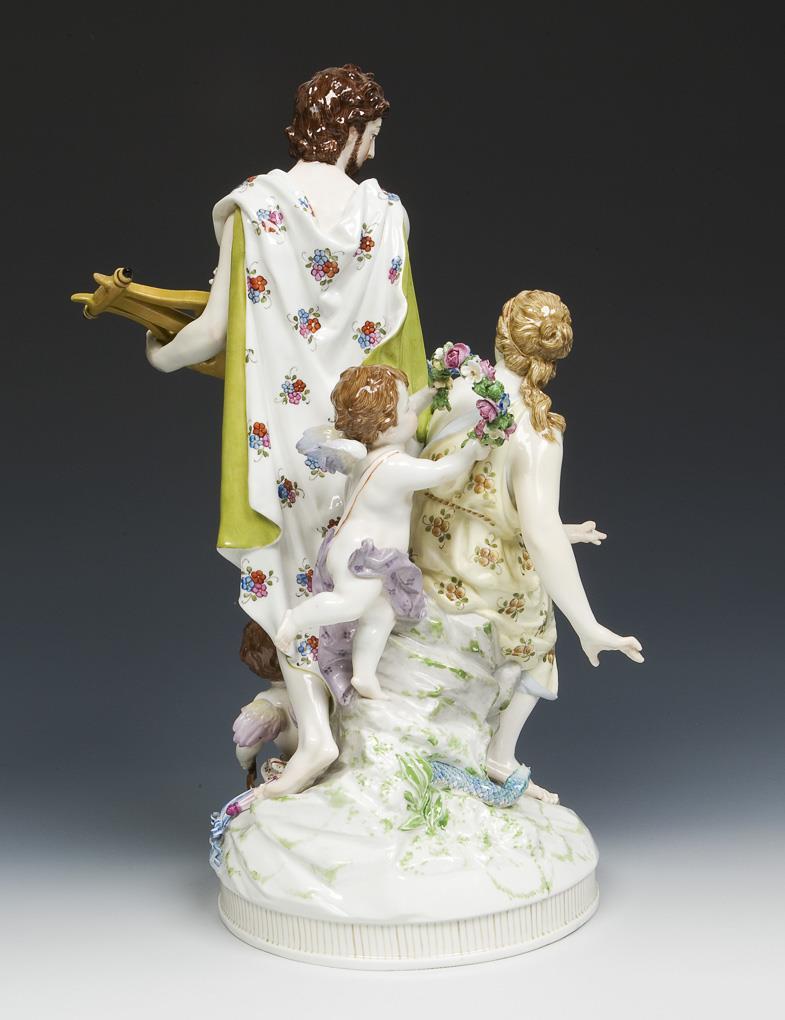 Ein Liebespaar der griechischen Mythologie. Orpheus, der Sänger und Dichter, betörte mit seinem Gesang, Götter, Menschen und Tiere. Farbig bemalt, gold staffiert. Blaue Zeptermarke, rote Reichsapfelmarke, schwarze Kriegsmarke, Ritzmarke, Pressmarke, Malermarke. Eine Hand, Pfeil, ein Fuß an Amorette, Arme und Décolleté an Eurydike, Lyra, ein Arm an Orpheus restauriert, Bogen, ein Finger bestoßen, lose vorhanden.