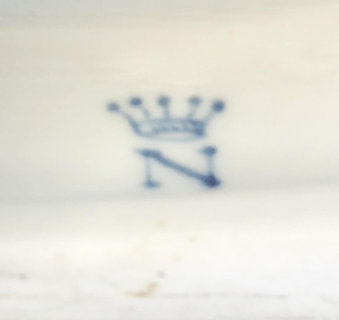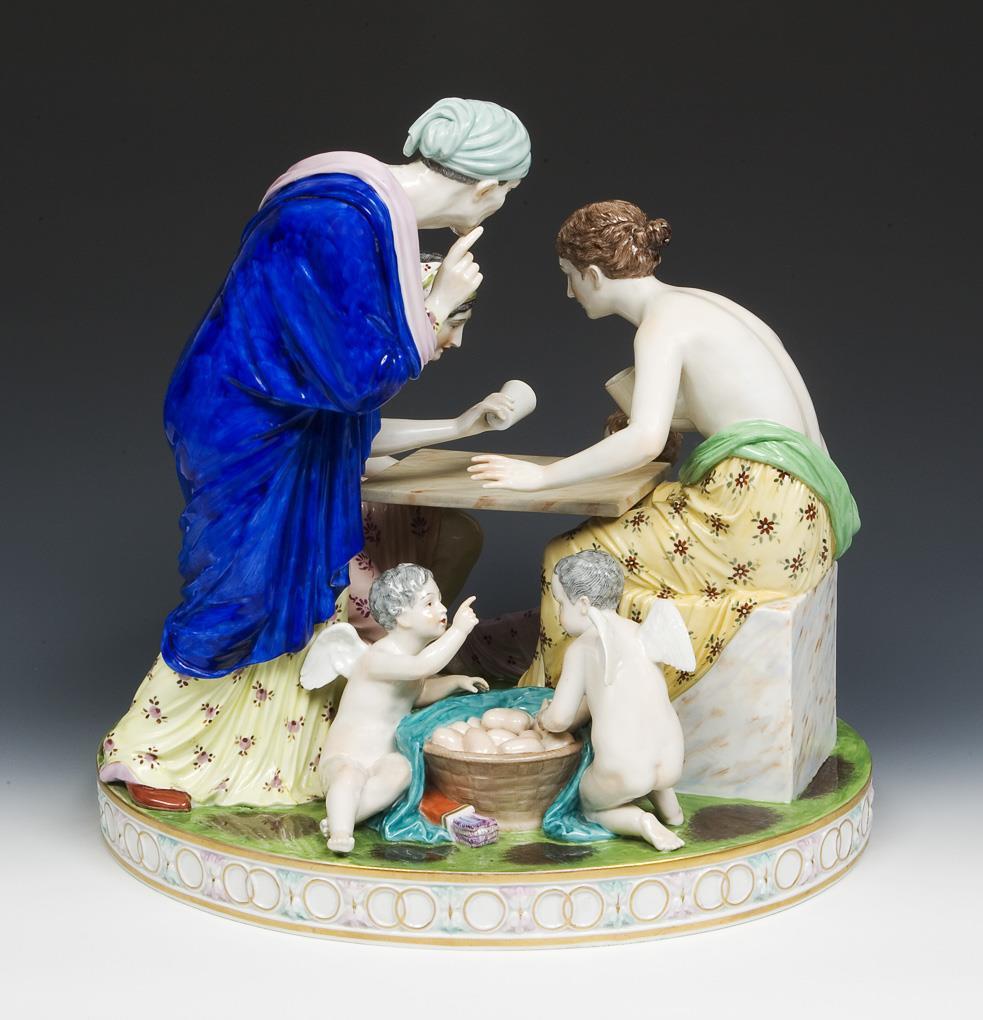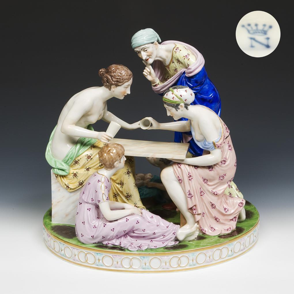 Gruppe mit sechs Figuren im klassizistischen Stil. Farbig bemalt, gold staffiert. Unglasierter Boden, bekrönte (Pseudo-Neapel) N-Marke. Tischplatte, eine Hand unter der Platte, ein Becher, ein Finger, eine Flügelspitze, ein Amoretten-Finger, ein Amoretten-Arm restauriert, ein kleiner Brandriss.