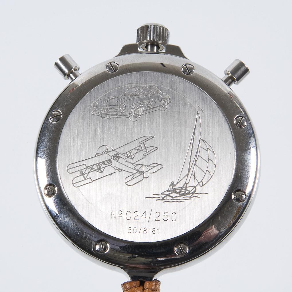 Limitiert, nummeriert: 24/250. Kronenaufzug. Mechanisches Präzisionswerk. Saphirglas, weißes Zifferblatt, arabische Zahlen. Hilfszifferblätter für 60-Minuten- und 12-Stundenzähler. Verschraubter Boden, graviert mit Segelboot, Doppeldecker und Mercedes 300 SL. Lederband. Zertifikat, Bedienungsanleitung. Original-Box, Karton. Im Kurzzeit-Test funktionstüchtig.