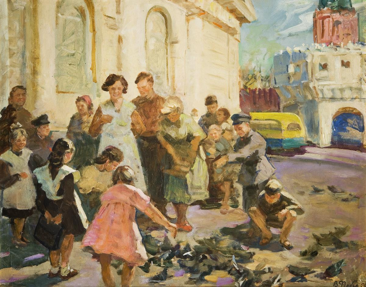 Eine friedliche städtische Genreszene mit einer humorvollen Thematik im Sonnenlicht. Rückseitig kyrillisch bezeichnet. Profilierter Rahmen.