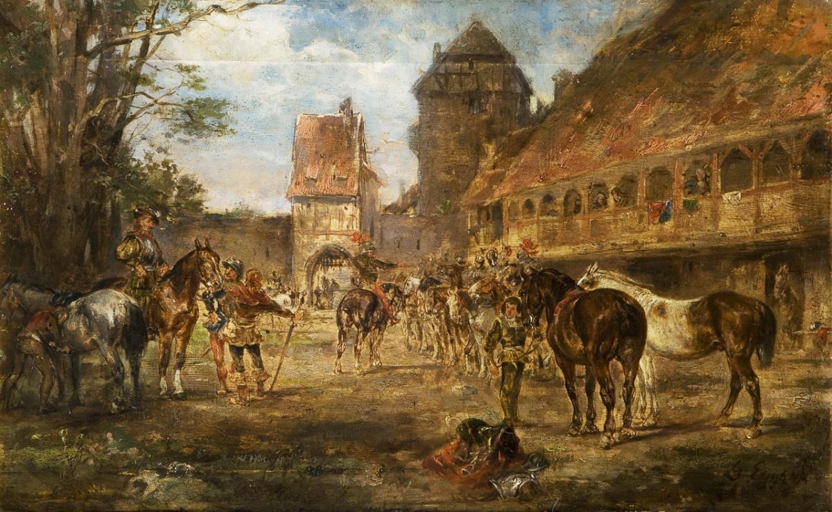 Historische Genreszene mit zahlreichen Rittern, Pferden und Knappen vor einer Stallung in einem Burg-Innenhof. Schwerer vergoldeter Stuckrahmen. Rahmen partiell leicht defekt.