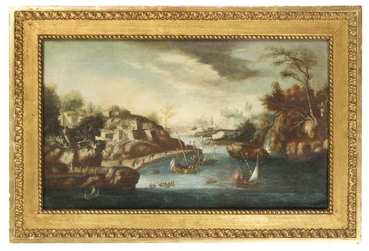 Weitläufige Ansicht mit märchenhafter Szenerie. Diverse Schiffe mit Besatzung, kleine Ruderboote und zahlreiche Passanten am Ufer vor einer imposanten romantischen Architektur- und Felskulisse. Neuwertiger vergoldeter Stuckrahmen. Doubliert, drei kleinere Fehlstellen gekittet.