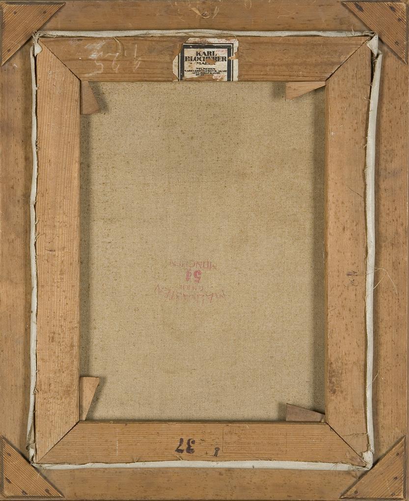 Auf dem Keilrahmen alter Klebezettel des Künstlers, datiert: (19)19, rückseitig Münchner Stempel. Farbig gefasster Profilrahmen des Künstlers.