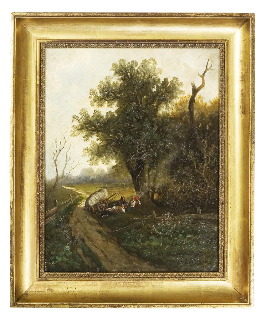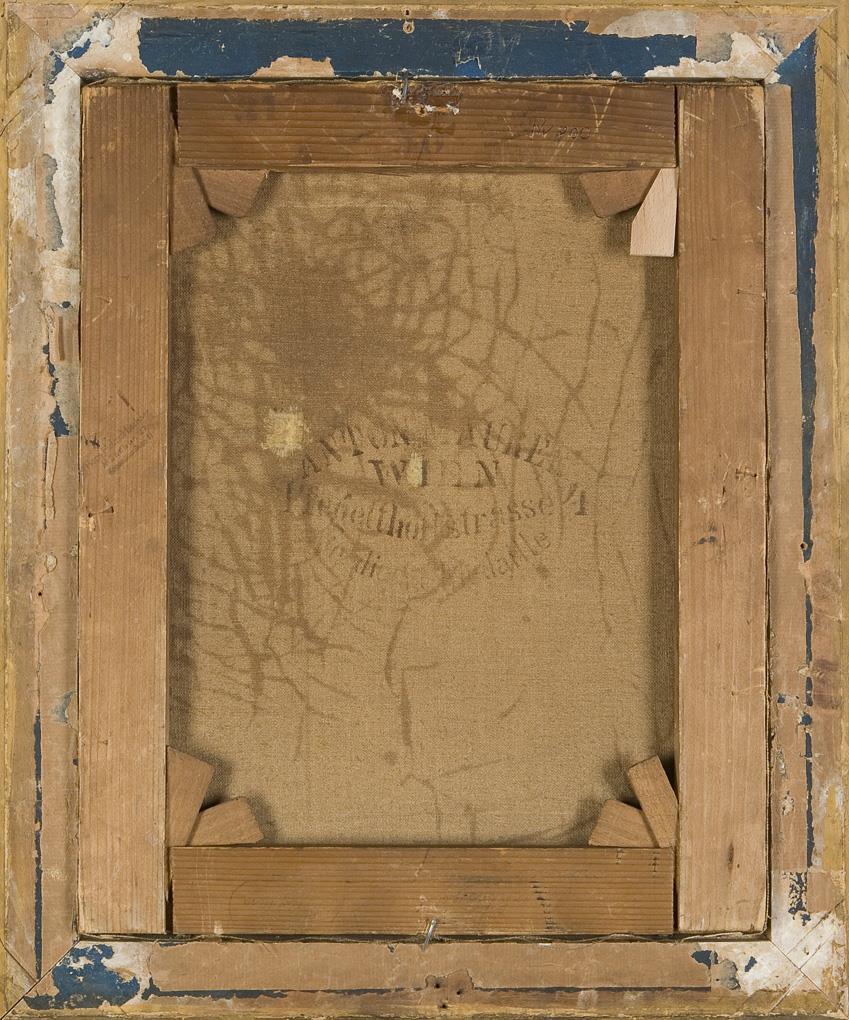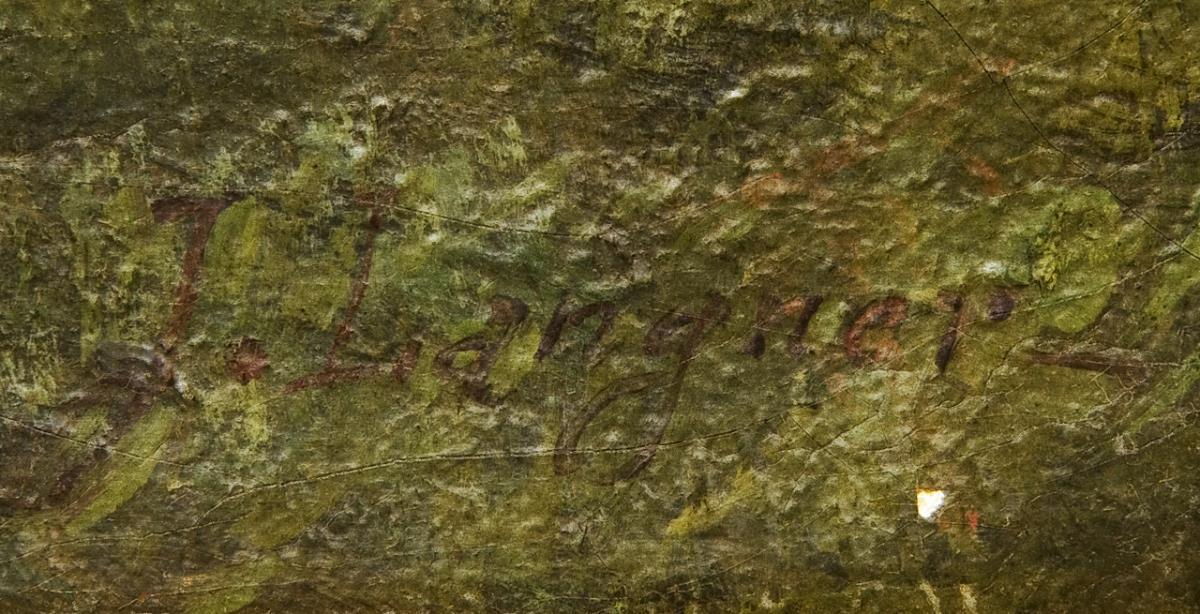 Kleinformatige Genreszene in romantischer Landschaft. Signiert: J. Langner, rückseitig Wiener Stempel. Originaler Keilrahmen mit Münchner Eigentums-Stempel. Profilierter Goldrahmen. Rückseitig zwei kleine Flicken, Craquelé.