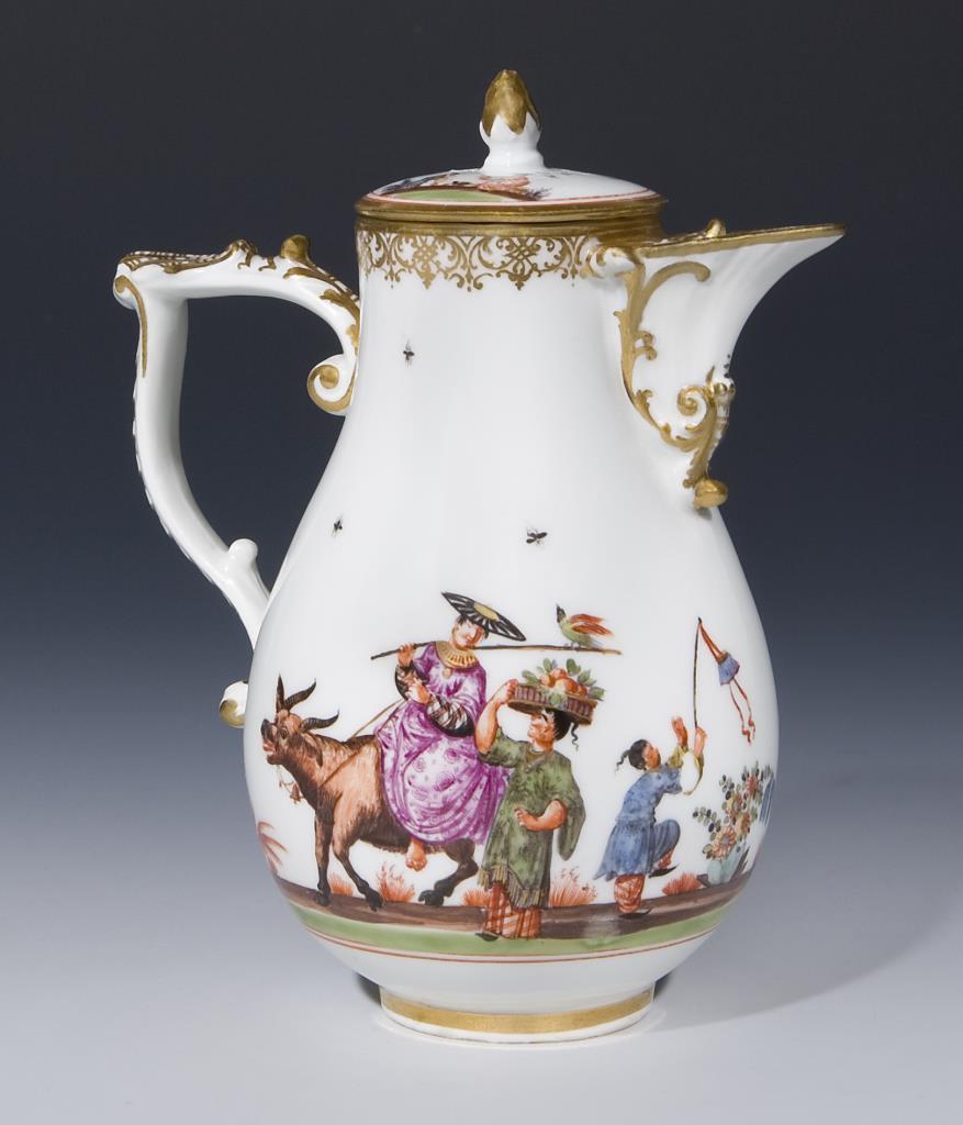 Beidseits feine farbige Bemalung mit verschiedenen Chinoiserien nach Vorlagen von Johann Gregorius Höroldt. Goldstaffage, am Rand Goldspitzenbordüre. Birnförmiger Korpus mit reliefiertem Ausguss und Henkel. Flachdeckel mit Zapfenknauf. Restauriert.