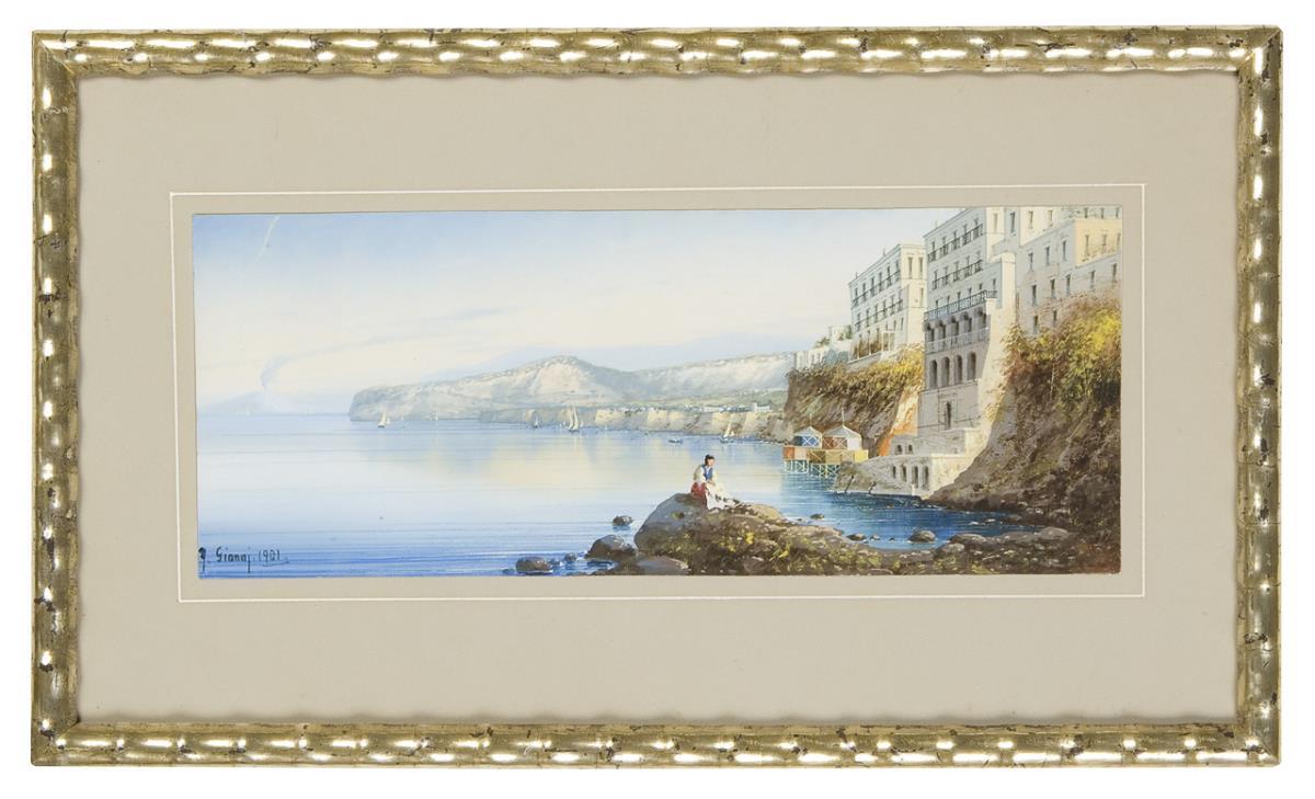 Weite, minutiös gemalte Küstenlandschaft in hellem Kolorit. Signiert: Y. Gianni. Verglaster Goldrahmen. Kleiner Kratzer im Himmel.
