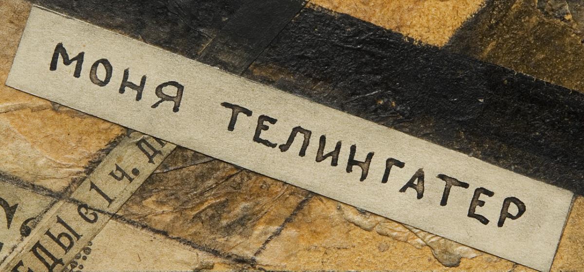 Interieur-Darstellung mit verschiedenen aufgeklebten Elementen. Eine typische alltägliche Genreszene, gekoppelt mit einem verführerischen Revue-Girl. Kyrillisch und lateinisch bezeichnet. Neuwertiger verglaster Rahmen. Eine kleine Ecke oben defekt.