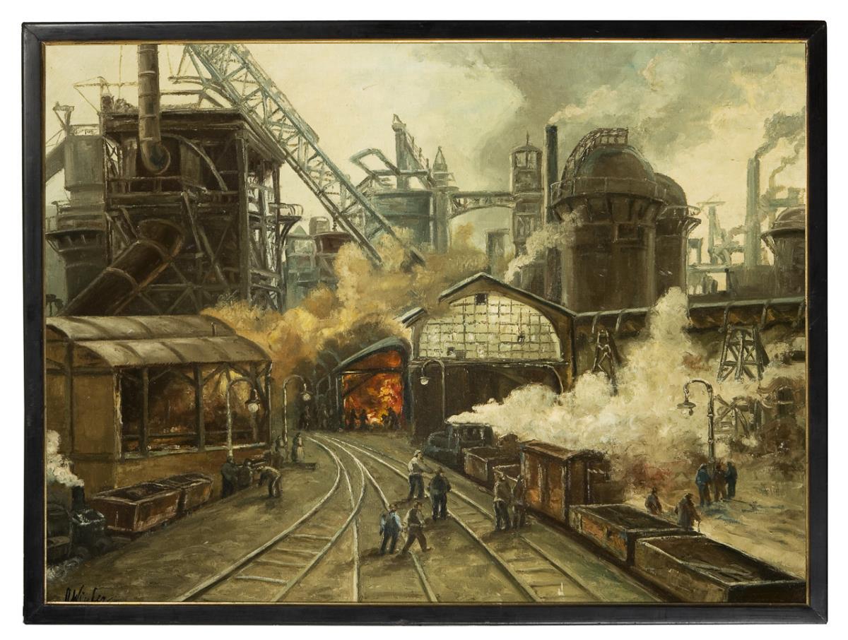 Das Industrie-Motiv als Darstellung der Leistungskraft des Unternehmens genau und detailreich gemalt. Originaler Keilrahmen mit Düsseldorfer Stempel Legrand & Co., schlichter geschwärzter Rahmen. Himmel minimal restauriert.