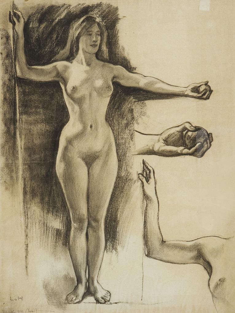 Handzeichnung - stehender weiblicher Akt mit Apfel