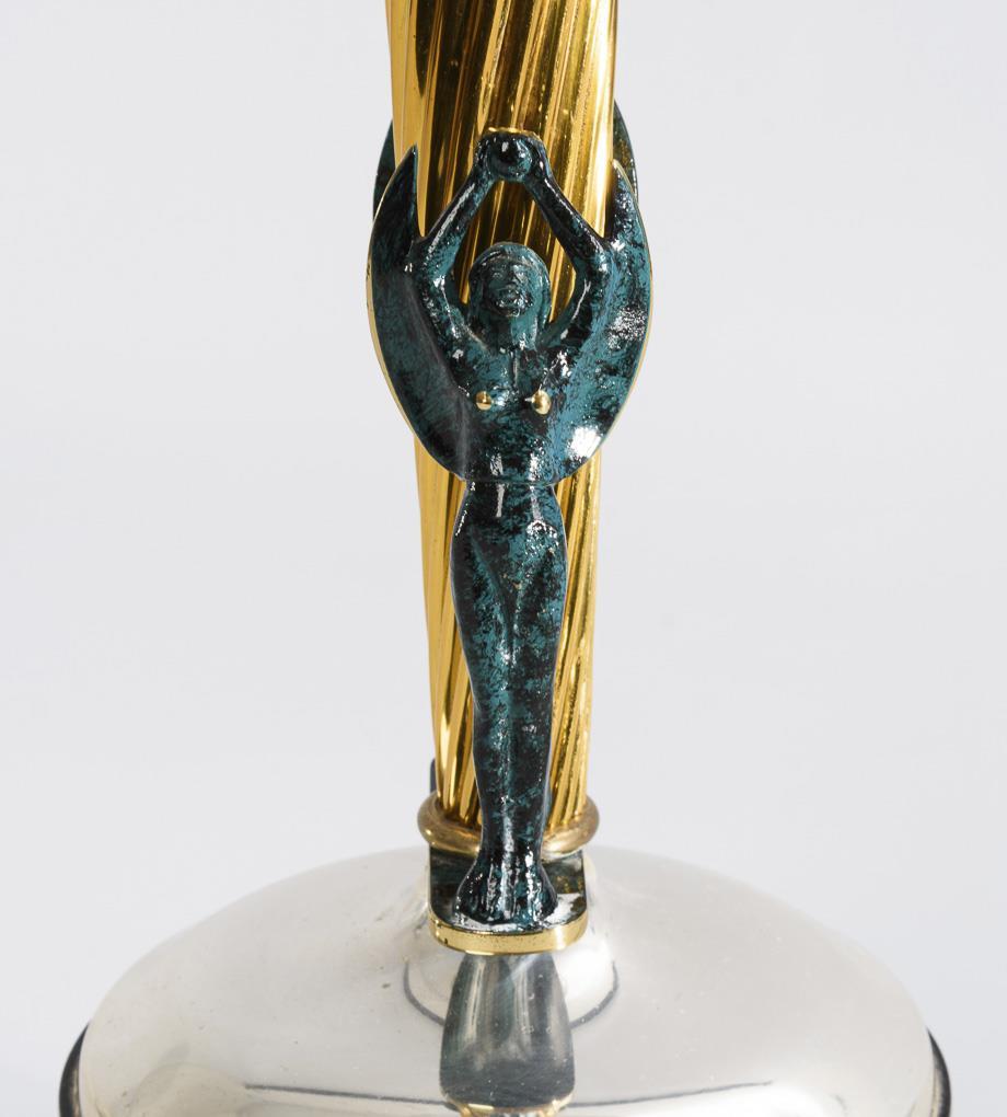 Schwarz lackiertes Holz, Messingguss lackiert, Messingblech, silberfarbenes Metall. H 45 cm, Ø 26 cm.