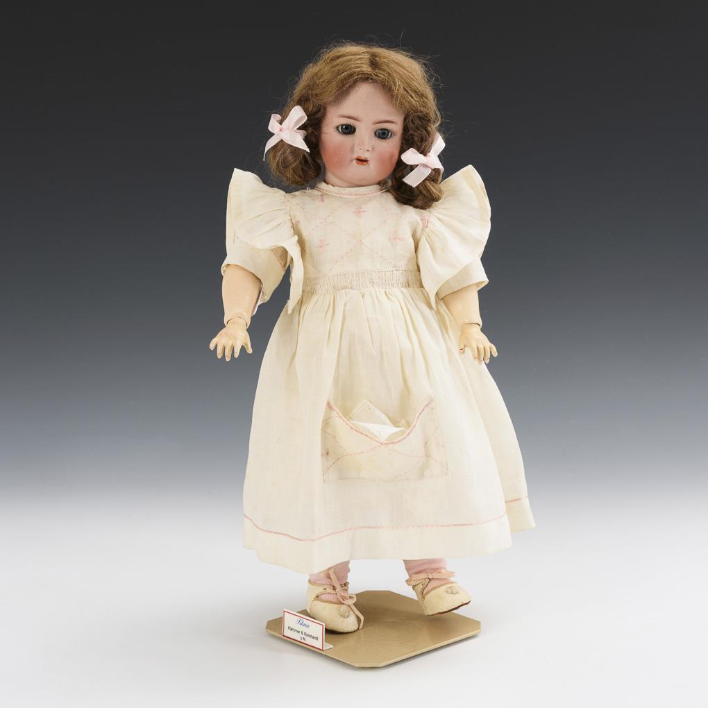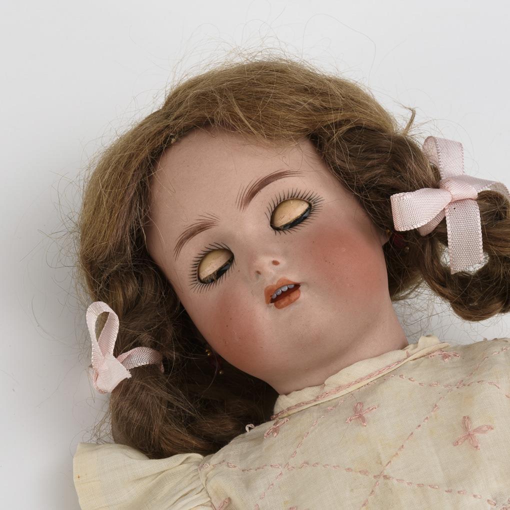Kurbelkopf, feste blaue Augen, Ohrringe, dunkelblonde Mohairperücke. 15-teiliger Gliederkörper. Weißes Kleid, rosa Haarschleifen, weiße Lederschuhe. Kopf nicht durchleuchtet, jedoch keine Defekte sichtbar.