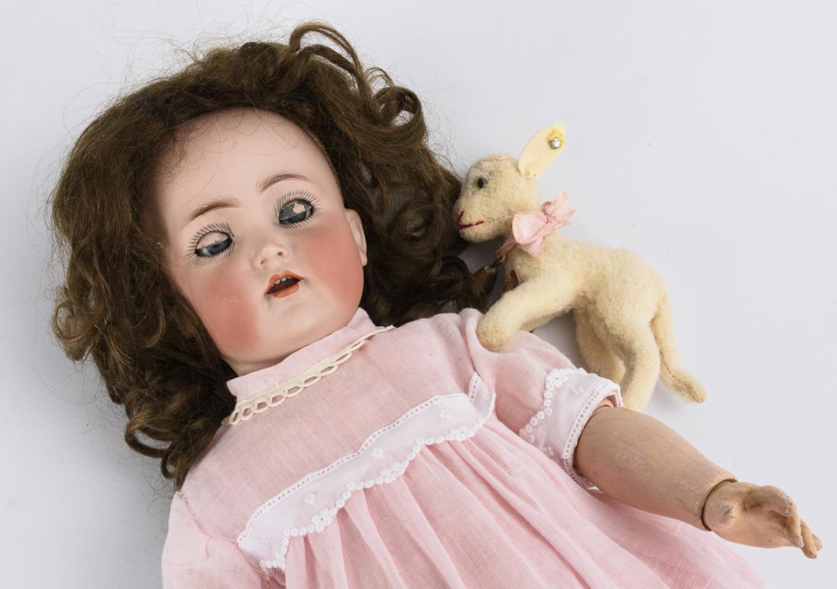 Kurbelkopf, blaue Schlaf-/Schelmenaugen, braune Mohairperücke. 13-teiliger Gliederkörper. Rosa Kleid, braune Lederschuhe. Dazu Steiff-Lämmchen "Lamby" (H 11 cm). Kopf nicht durchleuchtet, da Augenaufhängung am Kopfdeckel befestigt: keine Defekte sichtbar.