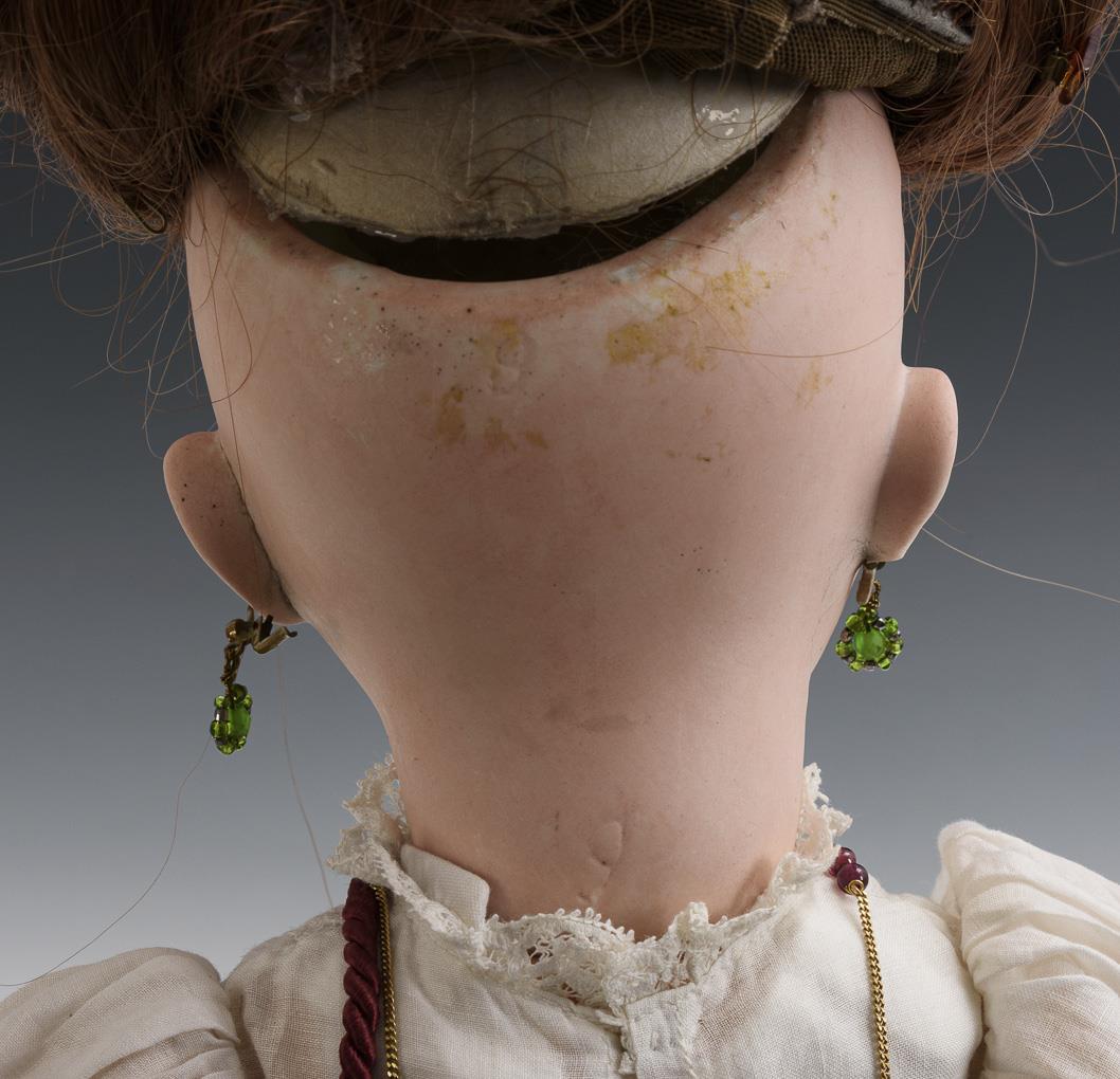 Kurbelkopf, grau-blaue Glasaugen, Ohrringe, jünger ergänzte rotbraune Echthaarperücke. 15-teiliger Gliederkörper. Weißes Kleid, braune Lederschuhe, Strohhut, weinrote Tasche mit Perlstickerei. Kopf durchleuchtet: einige Chips an der Halskurbel, Brandriss hinter dem linken Ohr. Körper mit Farbunterschieden.