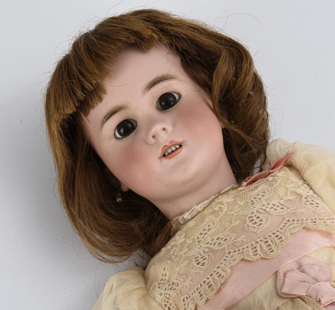 Kurbelkopf, feste braune Augen, Ohrringe, braune Echthaarperücke. 15-teiliger Gliederkörper. Cremeweißes Seidenkleid mit Spitze und rosa Borten, weiße Lederschuhe, rosa Sonnenschirm. Kopf durchleuchtet: lediglich minimal brandrissig hinter den Ohren und 1 winziger Chip am linken oberen Augenlid. Hände mit kleinen Reparaturstellen/Übermalungen.