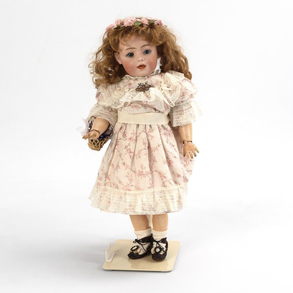 Kurbelkopf, blaue Schlafaugen, modellierte Zunge, ergänzte lange Mohairperücke mit Locken. 17-teiliger Gliederkörper. Weißes Kleid mit Rosenmuster, rosa Haarkranz, alte braune Schuhe, Blütenkorb. Kopf durchleuchtet: ohne Defekte. Mittelfinger links geklebt.