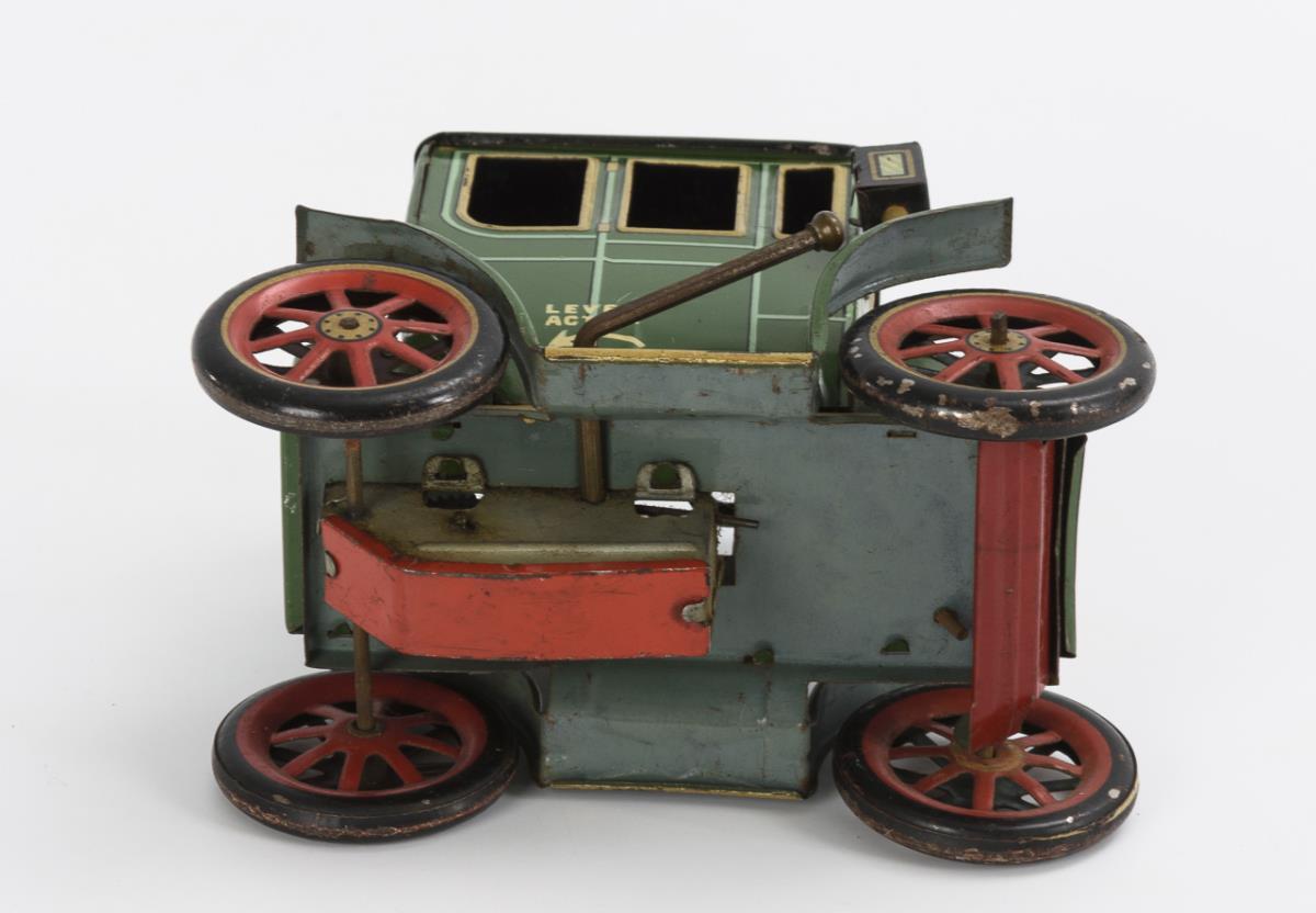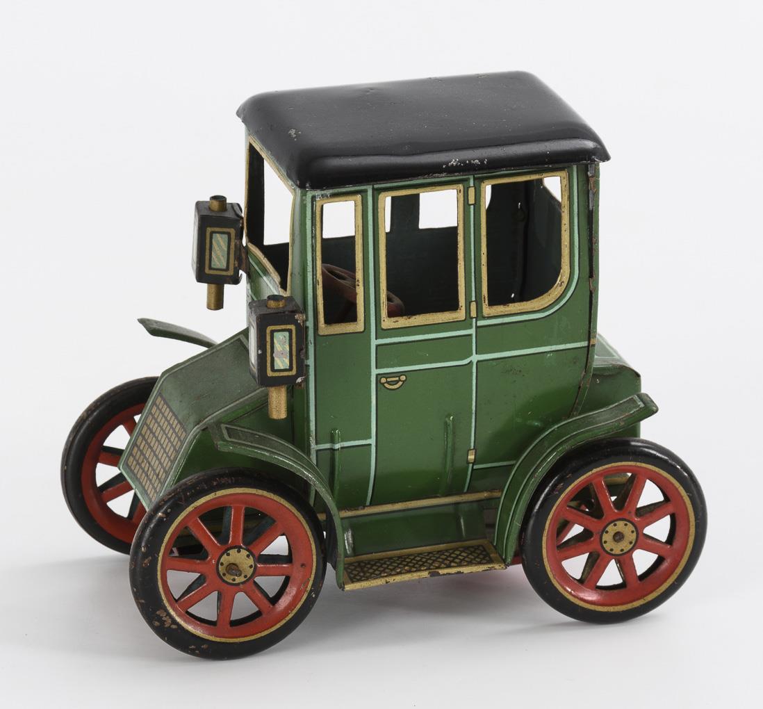 Kleines grünes Auto im Stil der frühen Fahrzeuge. Intaktes Werk mit Antriebshebel. Kleine Lackdefekte.