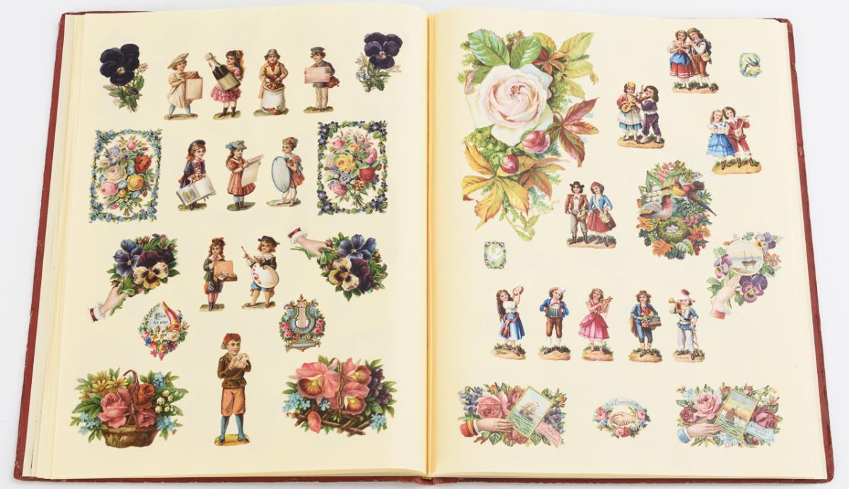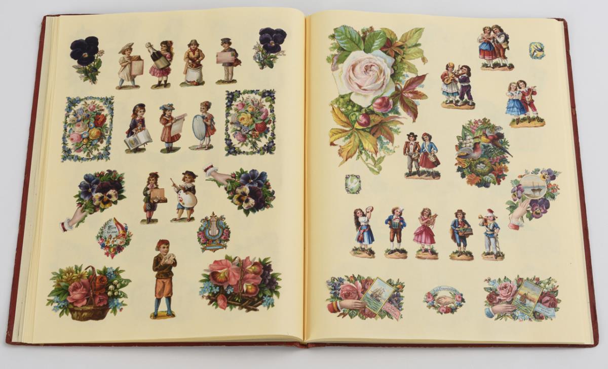 Je nach Themen sortiert dicht mit Luxuspapieren beklebt, u.a. Sakrales (Madonnen, Heilige, Andachtsbilder, Kreuze usw.), Blumen, Tiere, Damen, Mode, galante Szenen, Kinder, asiatische Motive, betitelte Literatur- und Opernszenen, Karikaturen usw. Alben mit einigen Alters-/Gebrauchsspuren, Ledereinband teils erneuert.