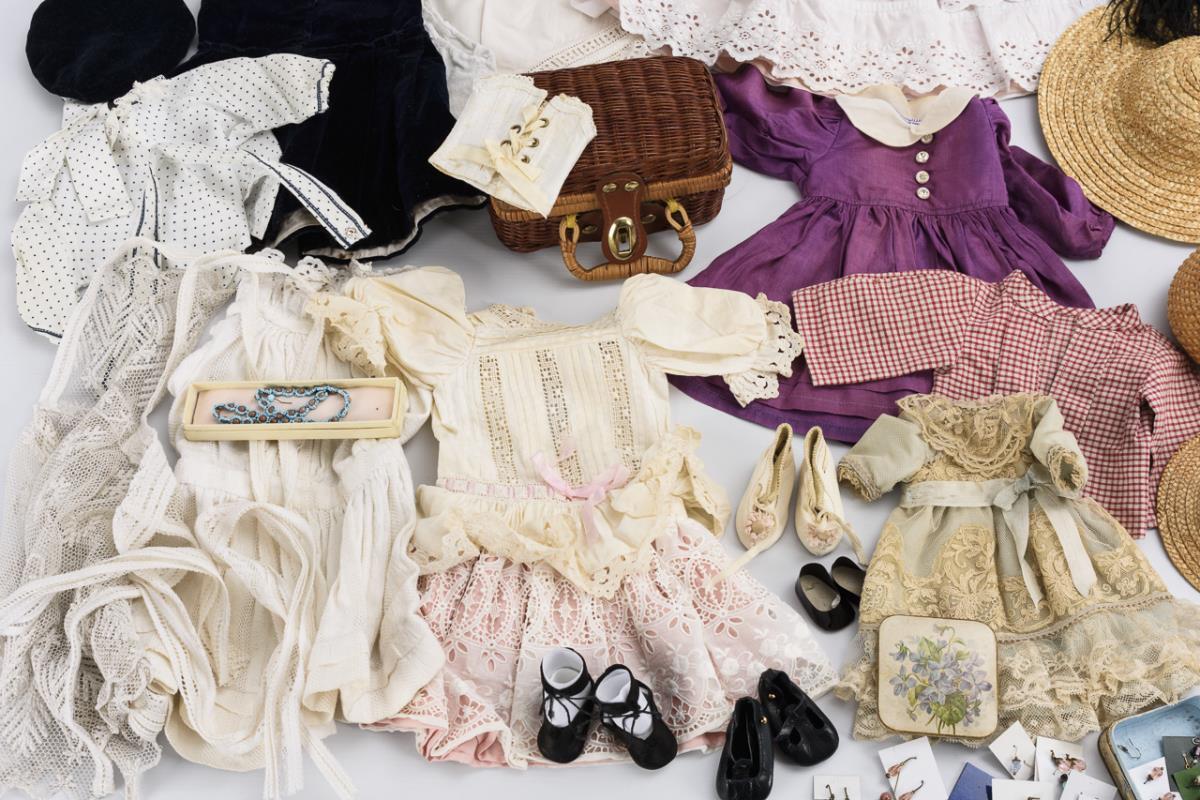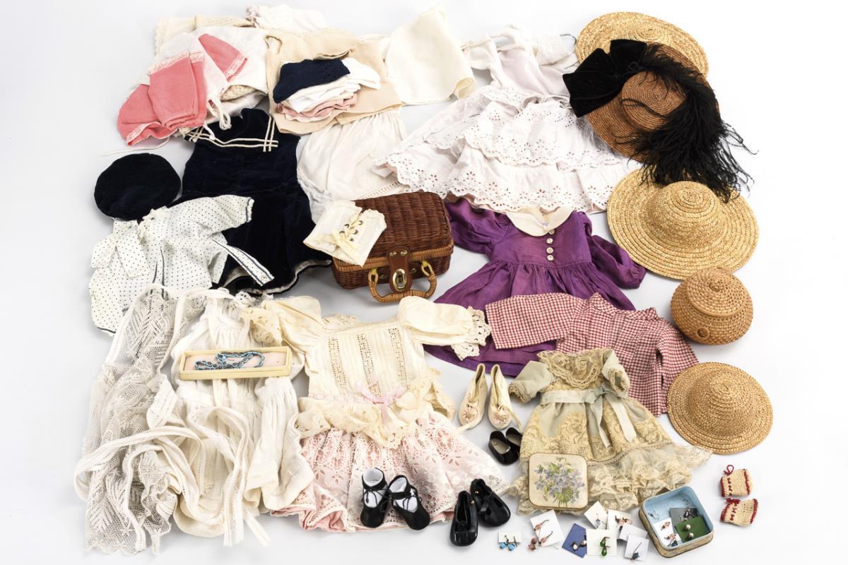 Ca. 25 Teile Kleidung in verschiedenen Größen, dazu Strümpfe, 4 Paar kleine Puppenschuhe, 2 Körbchen, 4 Hüte, etwas Schmuck etc.