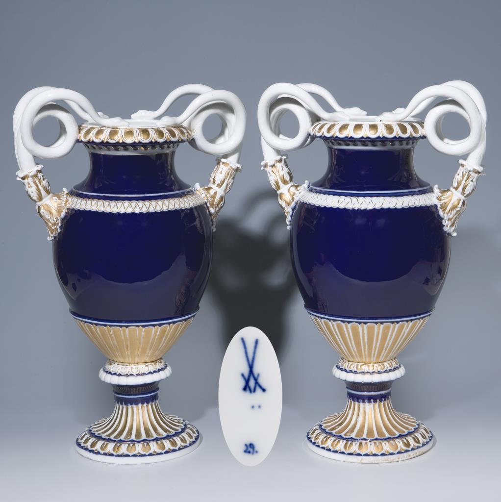 Balusterförmiger Korpus mit hochgezogenen Handhaben in Form von Schlangenpaaren über montiertem Rundfuß. Gold berieben, partiell nachgearbeitet.