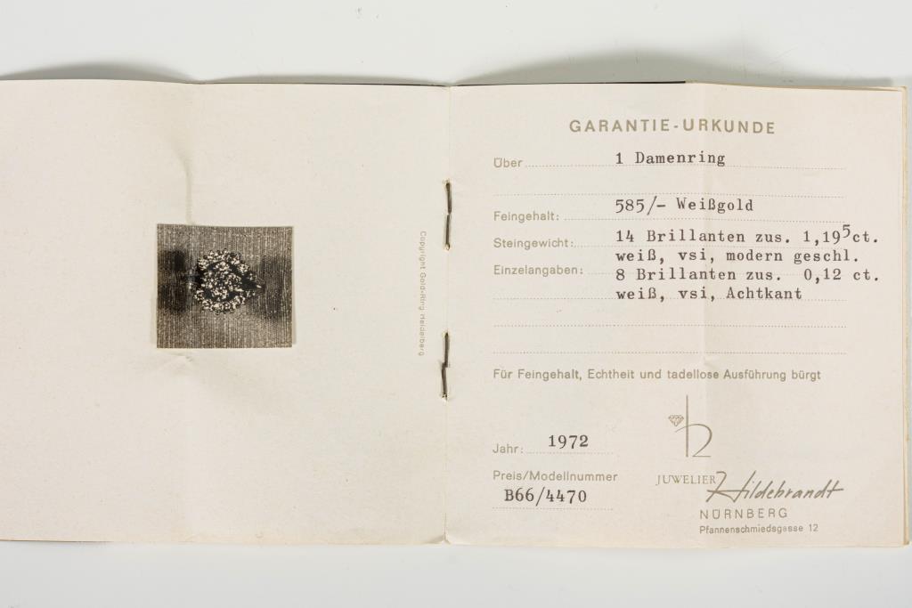 Dabei Garantie-Urkunde (Expertise) mit Foto und Daten von Juwelier Hildebrandt, Nürnberg 1972. * Partnerauktion Bergmann.