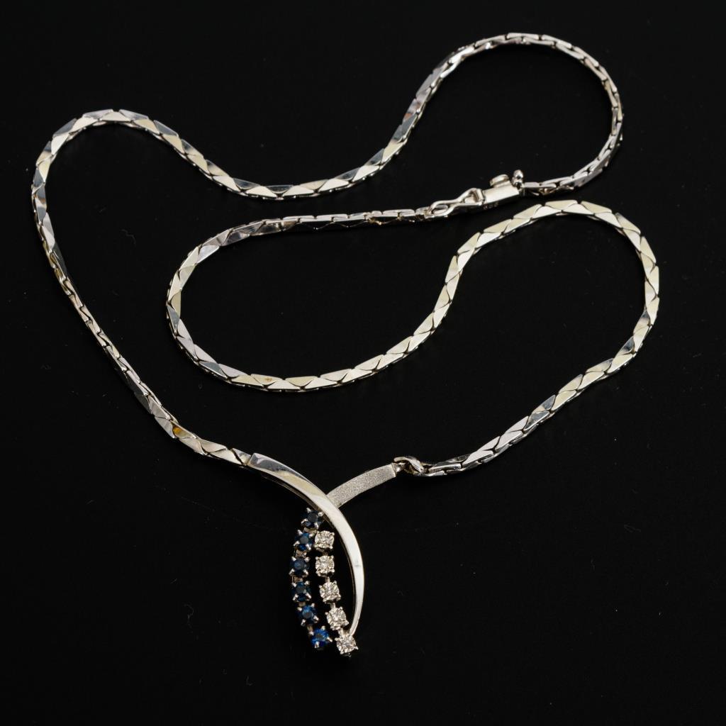 5 kleine Diamanten und 6 kleine Saphire in Krappenfassungen, zwischen Dreieckspanzerkette. Kastenschließe mit Sicherungsöse. Kette an einem Ende beschädigt.