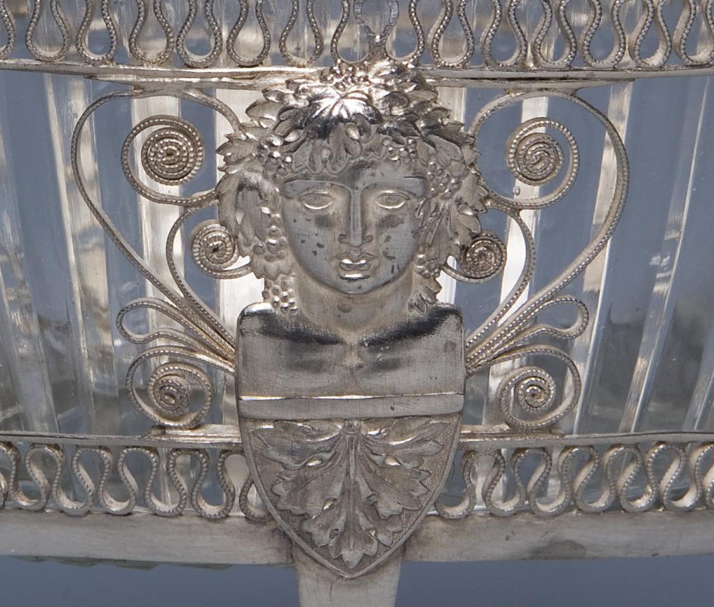 Filigran durchbrochen gearbeitet. Originaler farbloser Glaseinsatz mit Schliffdekor. Ohne Marken.
