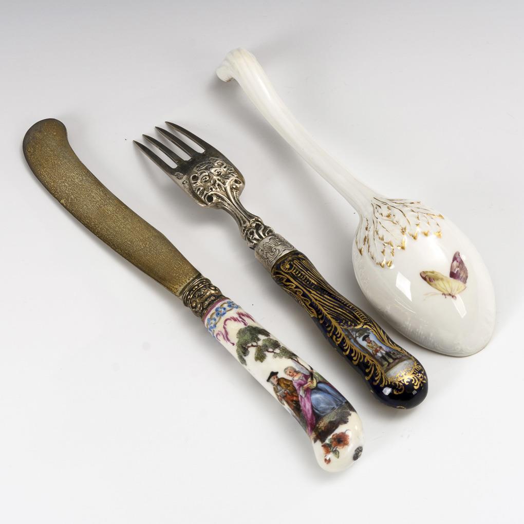 1x Messer mit viktorianischer Silberklinge (gepunzt) und Porzellangriff mit Watteau-Malerei (L 23 cm). / 1x Gabel mit Silberzinken (gepunzt) und Porzellangriff mit Kobaltfond, reicher Goldstaffage und Soldatenmalerei. / 1x Servierlöffel, KPM Berlin, ungemarkt: mit Blumen und Schmetterlingen im Stil der Weichmalerei (L 19,5 cm). Messergriff restauriert.