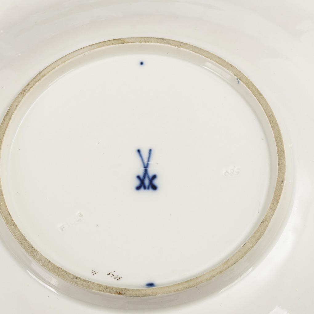 Schale mit muschelreliefierter Fahne und drei Rocaillschildern. Im Spiegel und in den Rocaillekartuschen Blumenmalerei. 1 kleine Randbestoßung.