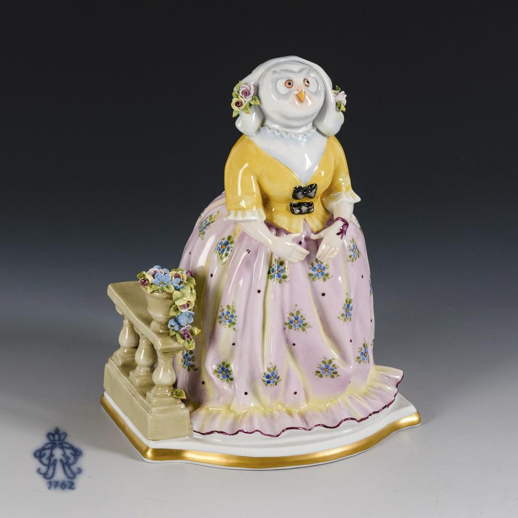 Humorvolle Darstellung einer stattlichen Sängerin mit Eulenkopf, gestaltet nach einer Zeichnung von Jean Jacques Grandville (1803-1847).