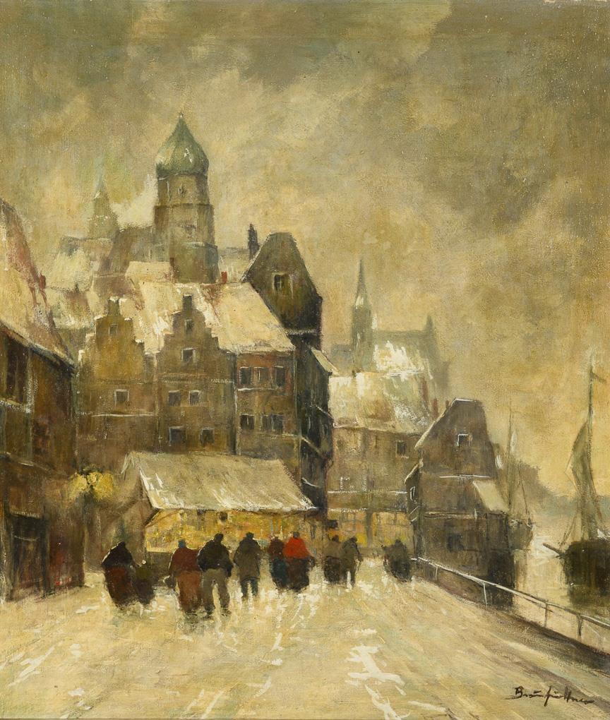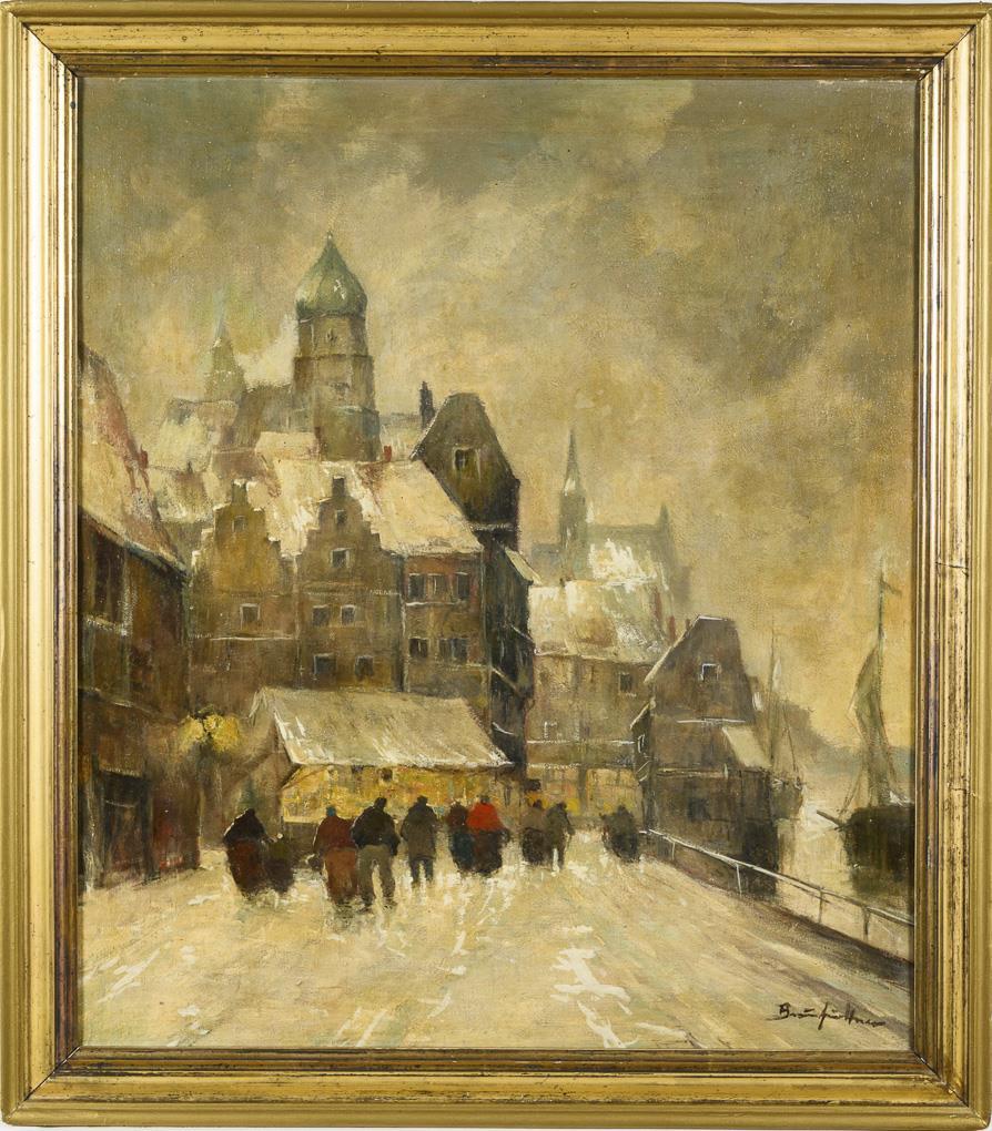 Mehrere Personen auf der glatten Straße vor den Häusern mit verschneiten Dächern. Leichte Altersspuren.