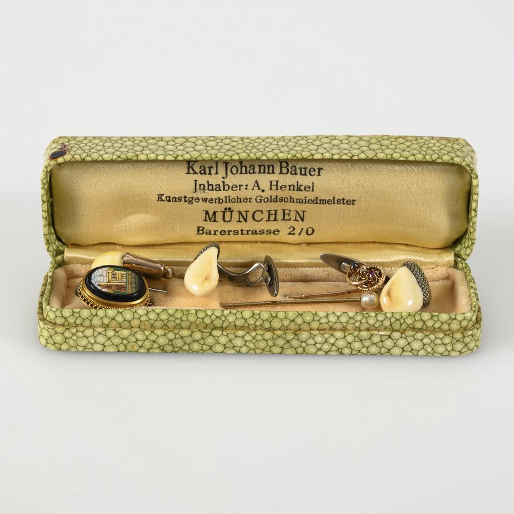 4 Krawattennadeln und Manschettenknopfpaar.
